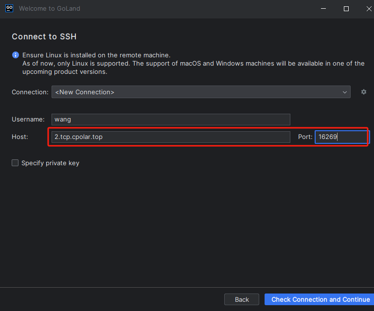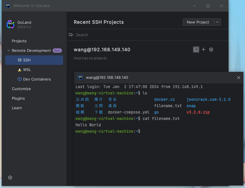 在 GoLand 中点击 New Project,填写 Username 和 Host(Username 指服务器端用户名,Host 为刚才获取的服务器本地 IP 地址)