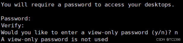5.系统将提示输入并验证密码以远程访问您的机器 6.验证密码后,可以选择创建仅供查看的密码。使用仅查看密码登录的用户将无法使用鼠标或键盘控制 VNC 实例,没有演示需要的输入 n 即可,后续如有需要可以再设置。