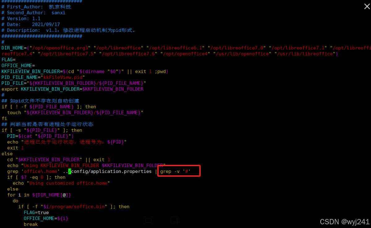 5、修改kkfileview的bin目录下的start.sh,将grep 'office\\.home' ../config/application.properties | grep '!^#' 改为grep 'office\\.home' ../config/application.properties | grep -v '#'后保存