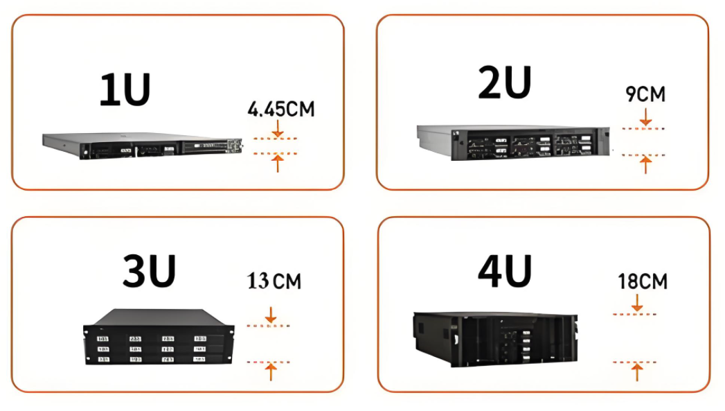 规定的尺寸是服务器的宽(48.26cm=19 英寸)与高(4.445cm 的倍数)。 由于宽为 19 英寸,所以有时也将满足这一规定的机架称为“19 英寸机架”。厚度以 4.445cm 为基本单位,1U 就是4.445cm。具体见下表: