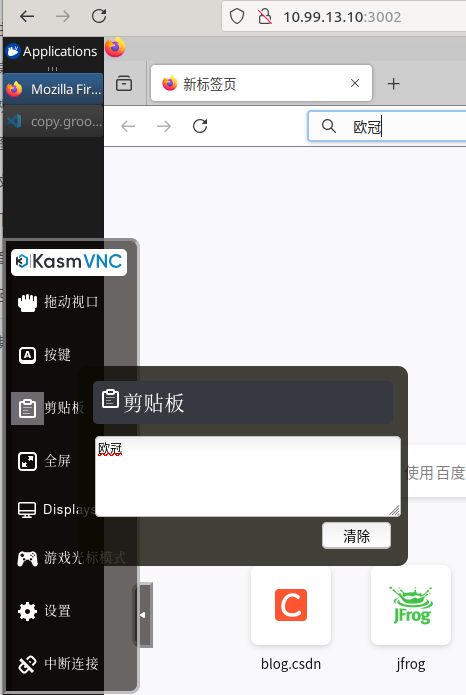 之后就可以在浏览器中访问网站了,中文的输入同理在左侧剪贴板中输入,复制,然后在内部粘贴使用,火狐浏览器初始也是英文的,在安装中文字体后同理可在设置中设置中文