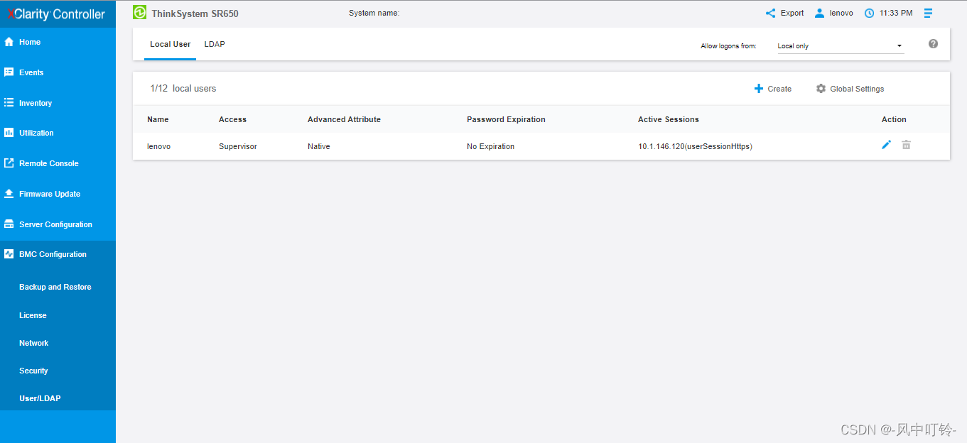 在用户登录界面输入登录的账户及密码后,点击登录进入xClarity Controller(以下简称为xCC)主界面。在主界面最下方点击BMC Configuration按钮打开子菜单,点击User/LDAP进入用户设置界面。点击用户后面Action按钮下方的编辑按钮,进入User Credentials and Authority设置页面,在User name后方的输入栏输入新的用名;在Password后方的输入栏输入用户密码;在Confirm password后方的输入栏输入新的密码;在Authority level后方的下拉选项框中选择Supervisor,点击下方的Apply按钮等待设置生效。