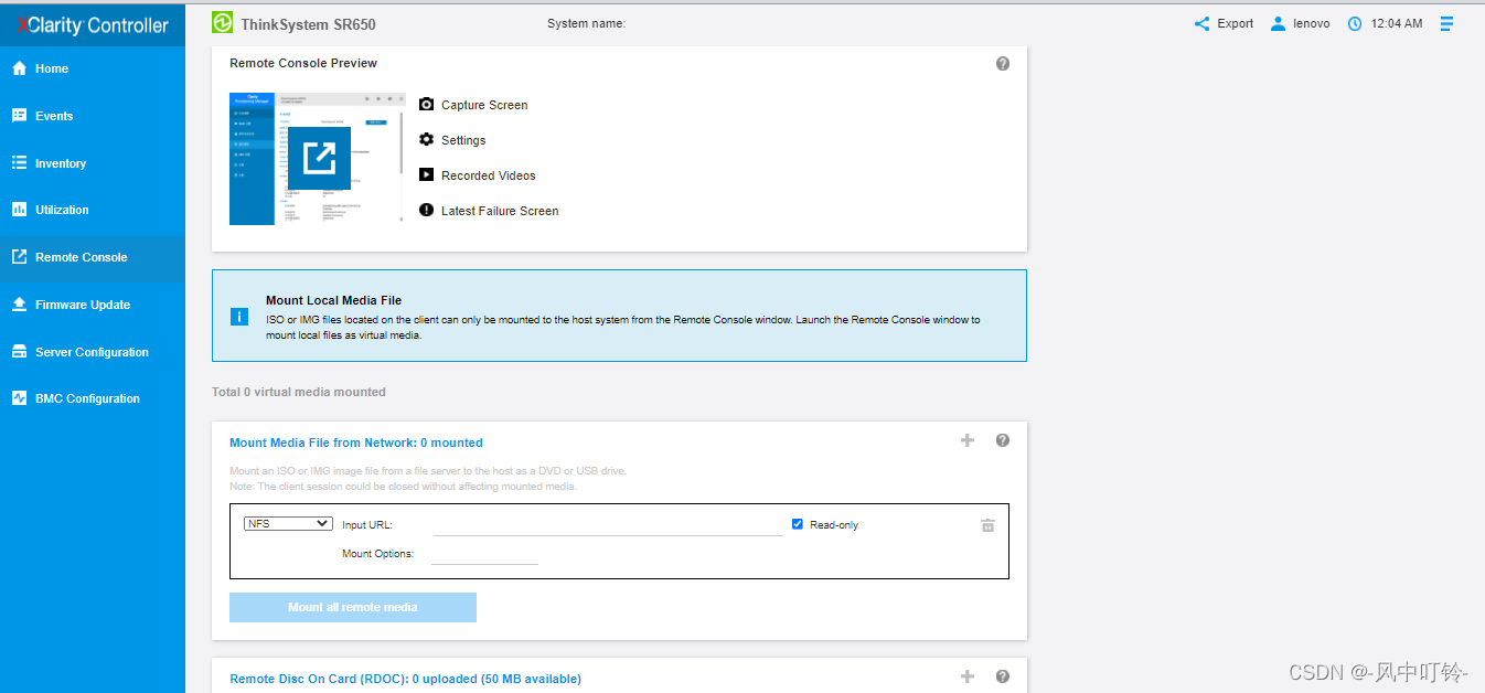 在用户登录界面输入登录的账户及密码后,点击登录进入xClarity Controller(以下简称为xCC)主界面。在主界面最下方点击BMC Configuration按钮打开子菜单,点击 Remote Console按钮,进入Remote Console Preview页面。
