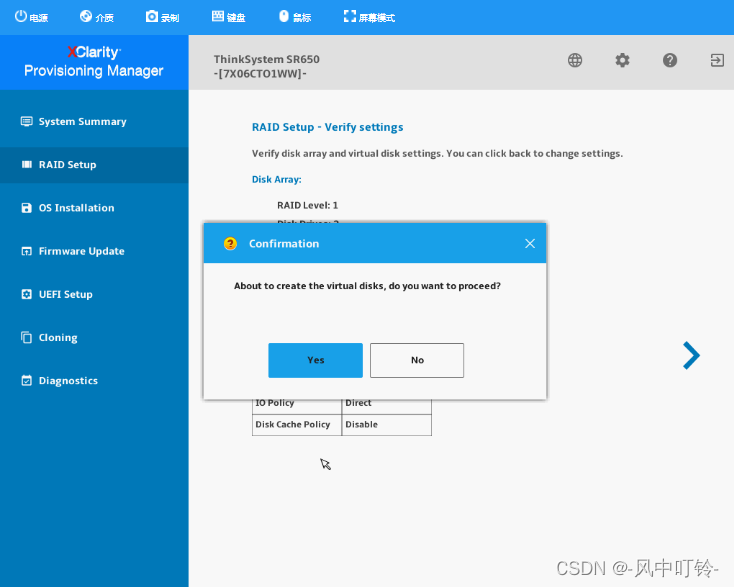 在Vertify Settings页面点击下方的蓝色箭头,弹出configure确认页面,键盘方向键移动到YES按钮上,按下Enter按钮,系统进入RAID设置页面。