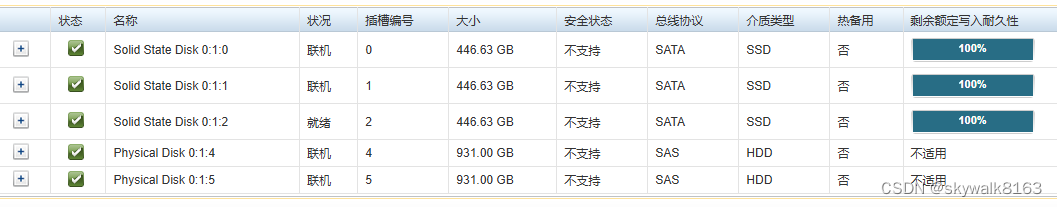 | Physical Disk 0:1:5 | 就绪 | 5 | 931.00 GB | 不支持 | SAS | HDD | 否 |