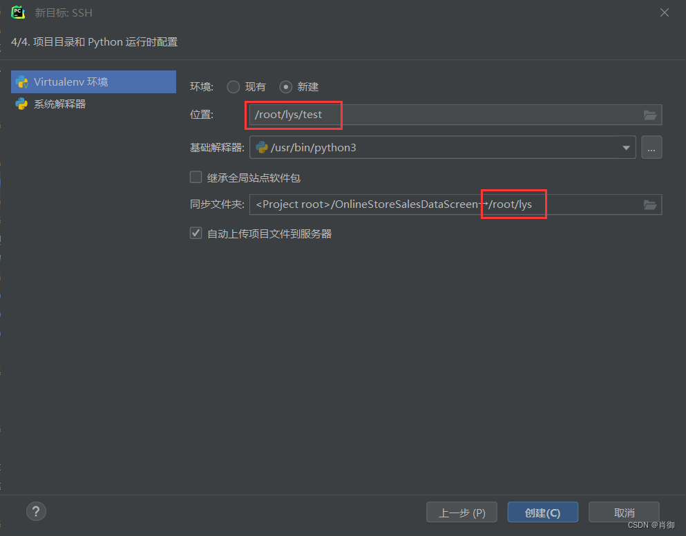 (2)更改虚拟环境和项目配置路径,路径配置好之后,点击创建即可,等待虚拟环境创建完成