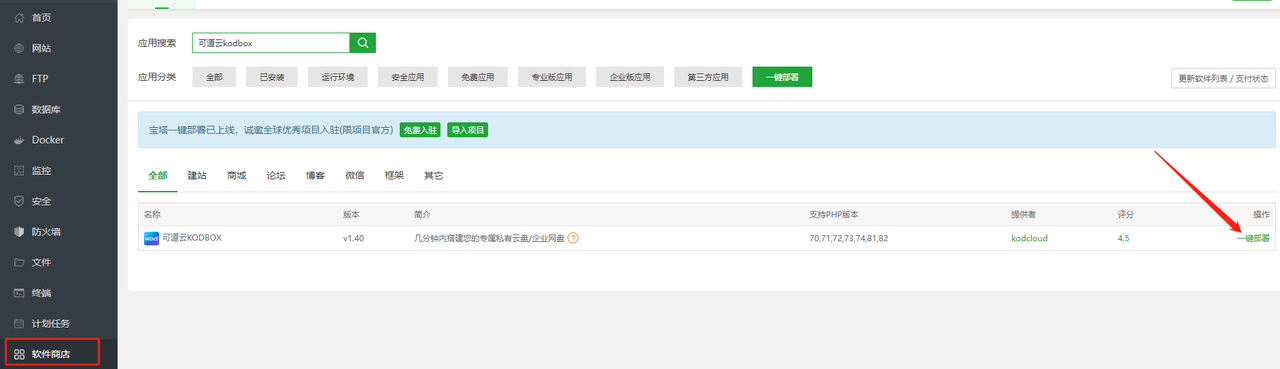 在宝塔面板界面点击左侧“软件商店”,搜索“可道云kodbox”选择一键部署。