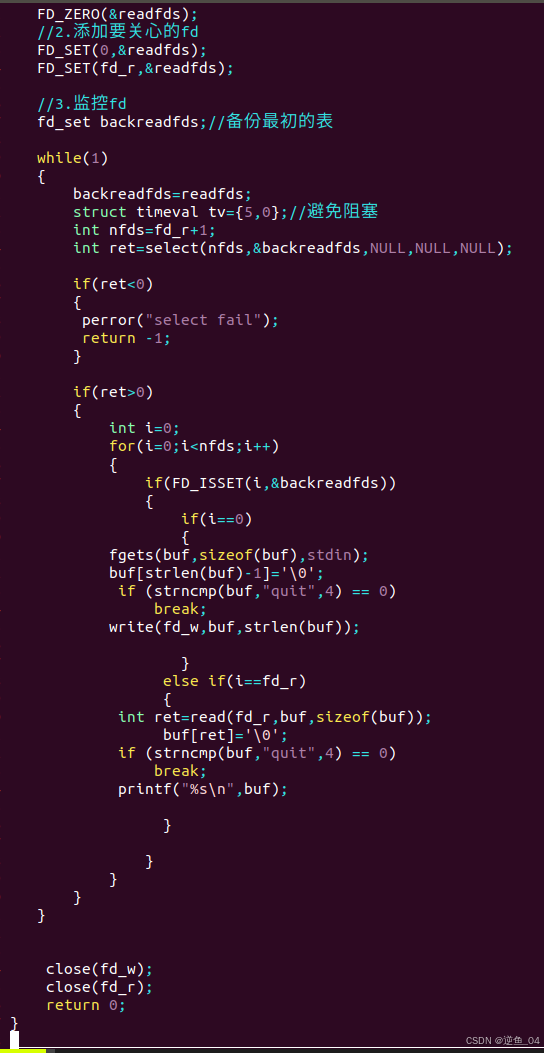 1. 参数的修改与拷贝 readfds 等参数是结果参数 : select 函数会直接修改传入的 fd_set(如 readfds、writefds 和 exceptfds)。 为了保留原始监听集合,通常会定义一个备份集合(如 allread_fdset),并将它的拷贝传递给 select。 示例: fd_set allread_fdset, readfds; FD_ZERO(&allread_fdset); FD_SET(fd1, &allread_fdset); FD_SET(fd2, &allread_fdset);