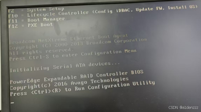 把导入好的u盘插到服务器上,连接好显示屏,启动服务器,当运行到如下界面时,按ctrl+r,切换至磁盘阵列界面,如果错过此界面,可能需重启服务器继续重复上述步骤。