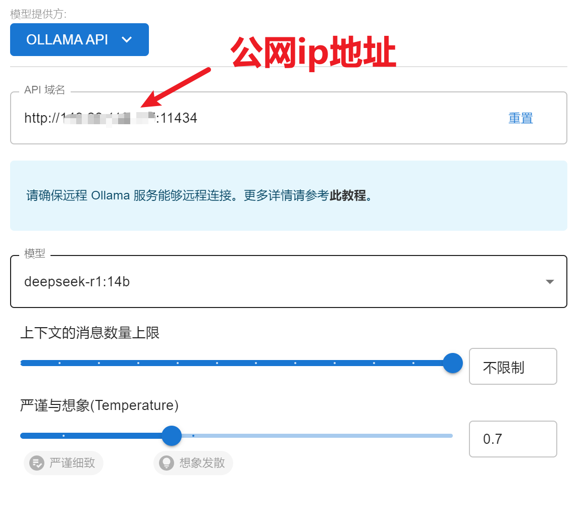 等待安装好之后,配置使用Ollama API方式对接deepseek大模型。