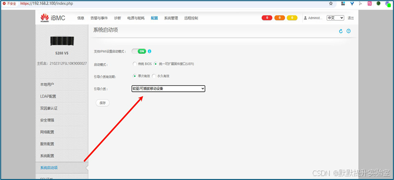 PS:可以用网线连接服务器,访问地址192.168.2.100,进入设置U盘为第一启动项。(默认用户名:Administrator,密码:Admin@9000。)