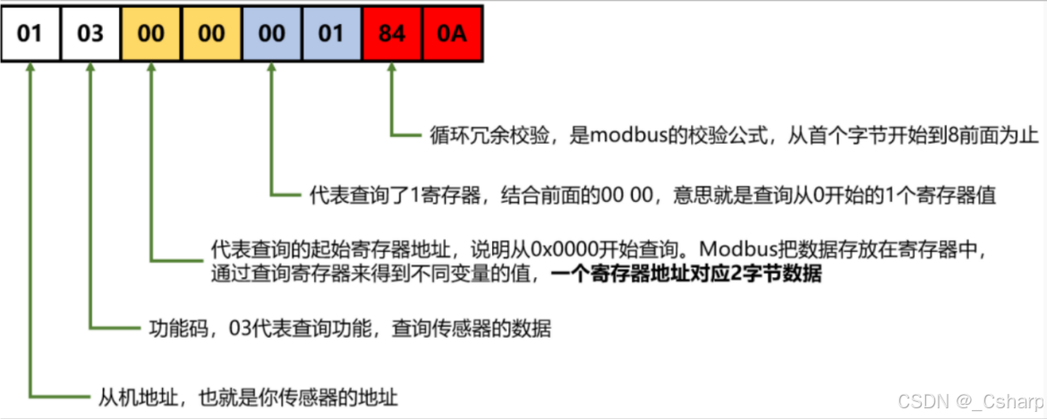 主机发送: 01 03 00 00 00 01 84 0A 从机响应: 01 03 02 19 98 B2 7E