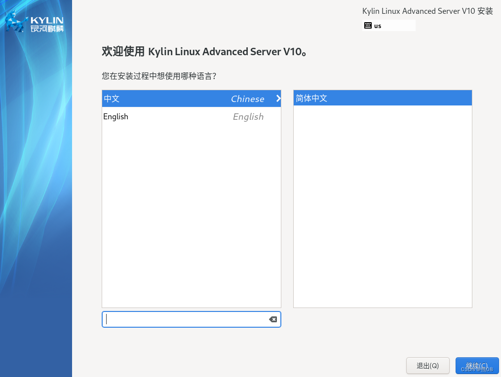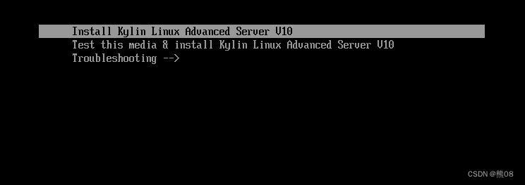 挂载系统的iso镜像文件,将虚拟机第一引导模式更改为cdrom,从光盘进行引导。引导,选择“Install Kylin Linux Advanced Server V10”(如下图1所示)。到语言选择界面(如下图2所示),按ctrl+alt+f2组合键到字符界面(如下图3所示)。