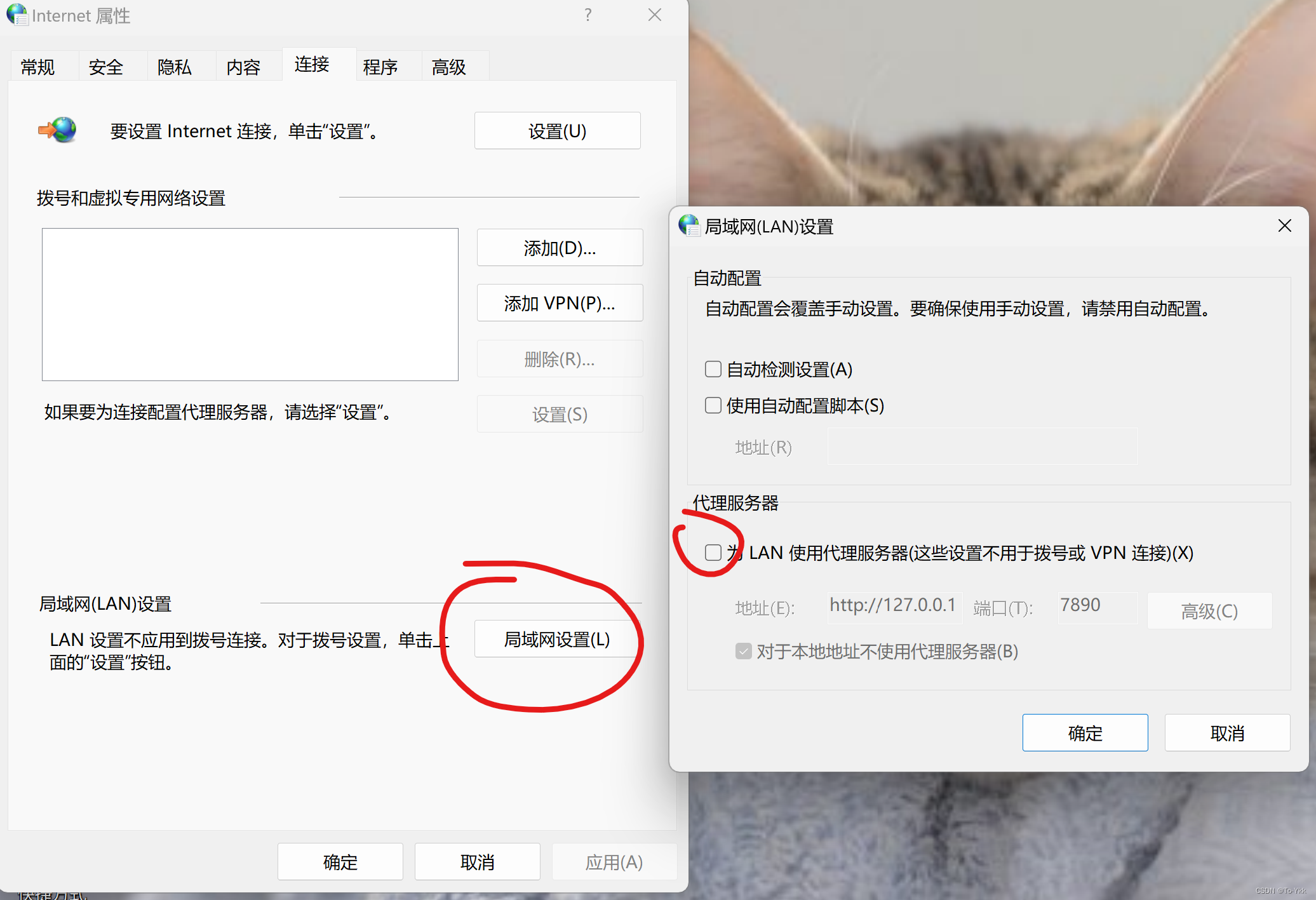 在控制面版中找到Internet选项,点击连接栏,在连接栏中选择局域网设置。之后将代理服务器下面的框选中的对勾取消。最终如下