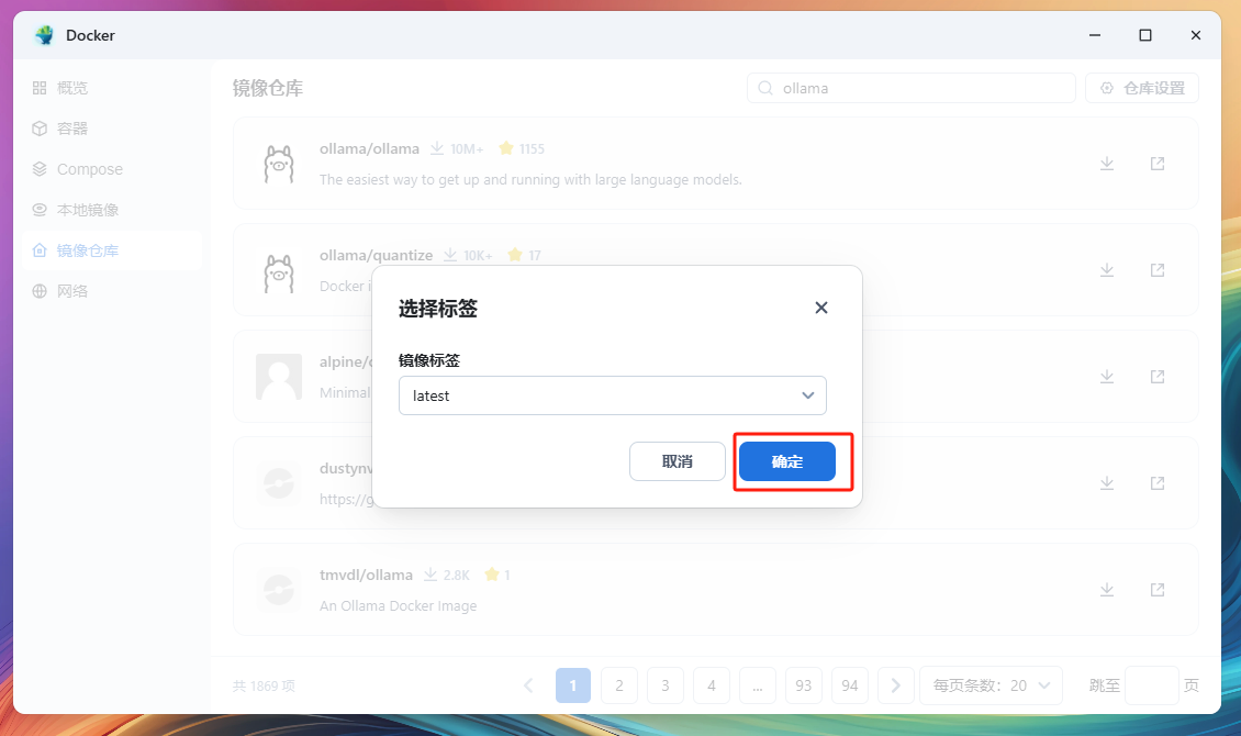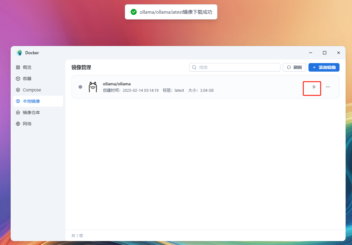 打开 Docker,选择镜像仓库,在搜索框中输入 ollama,第一个 1K+星星的就是,点击下载按钮: