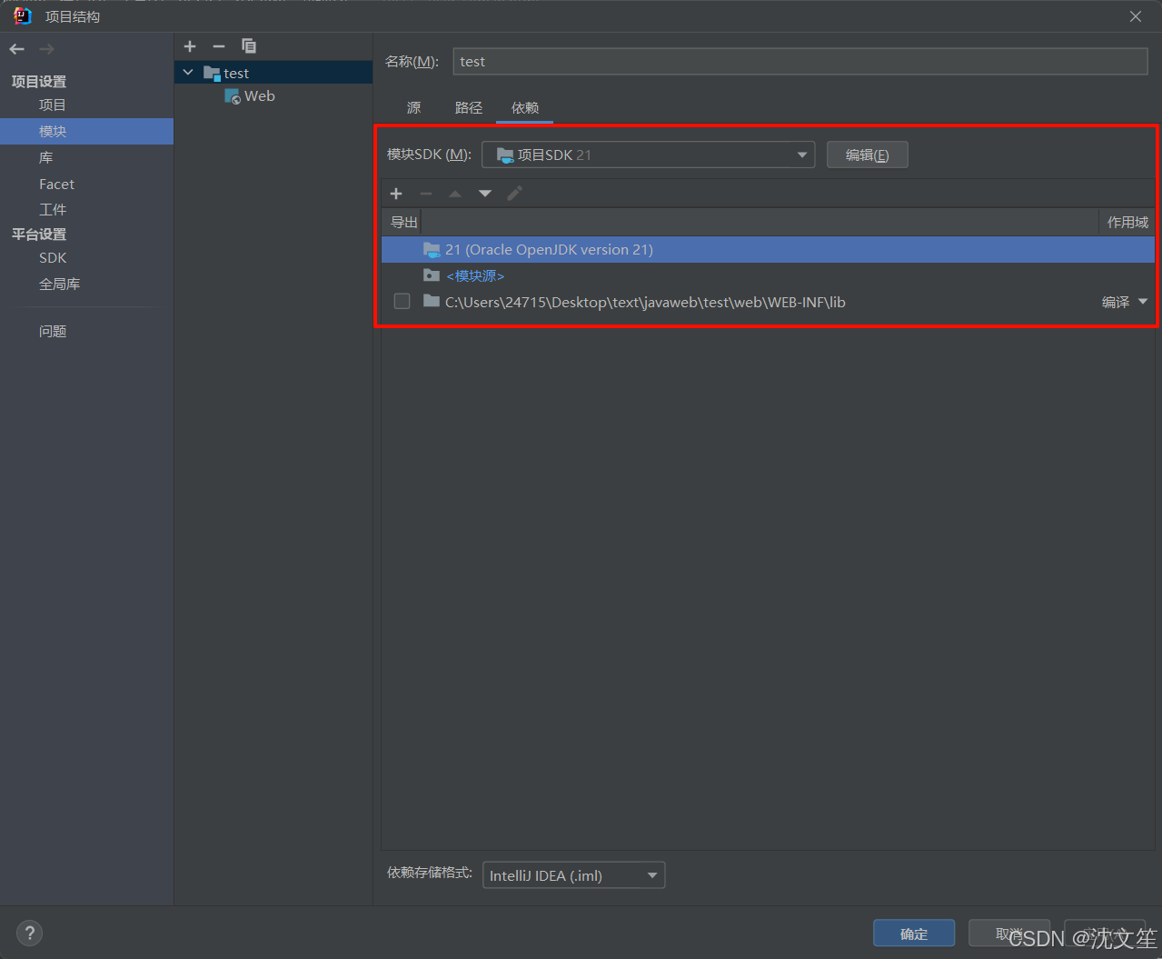 在项目结构界面中单击左侧菜单中的“模块”选项,单击“源”配置项,在项目web文件夹下的WEB-INF文件夹下创建classes和lib文件夹。