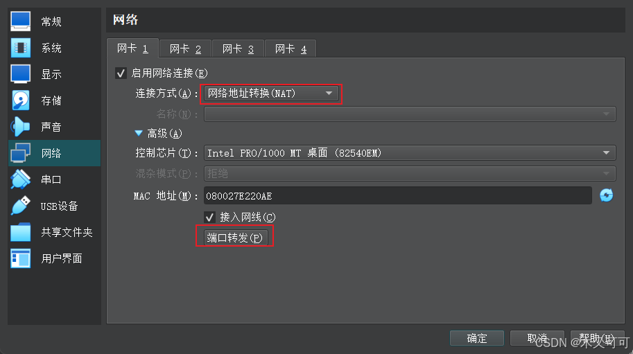 不过,如果是主机上的虚拟机的话,需要让虚拟机使用桥接网卡成为一台“独立”的计算机才行,如果是网络地址转换(NAT)的话,首先虚拟机的IP地址就很奇怪(10.0.2.15),而且连不上。然而如果确实需要在虚拟机为网络地址转换(NAT)时给它传文件,该怎么办呢? 这个时候需要手动设置一下虚拟机的端口转发,然后在使用scp的时候指定端口即可。 首先打开对应虚拟机的设置,然后找到“网络”