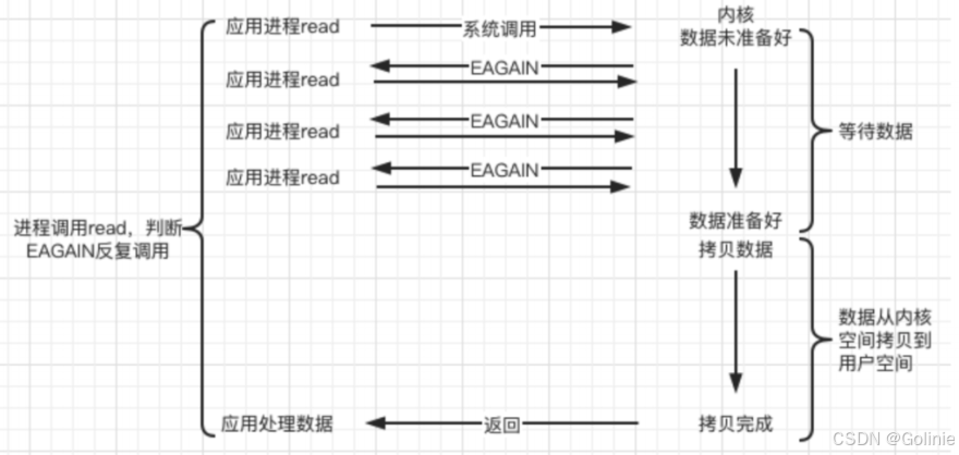 非阻塞等待,每隔一段时间就去检测I0事件是否就绪。没有就绪就可以做其他事。非阻塞I/0执行系统调用总是立即返回,不管事件是否已经发生,若事件没有发生,则返回-1,此时可以根据 errno 区分这两种情况,对于accept,recv和send,事件未发生时,errno通常被设置成 EAGAIN。