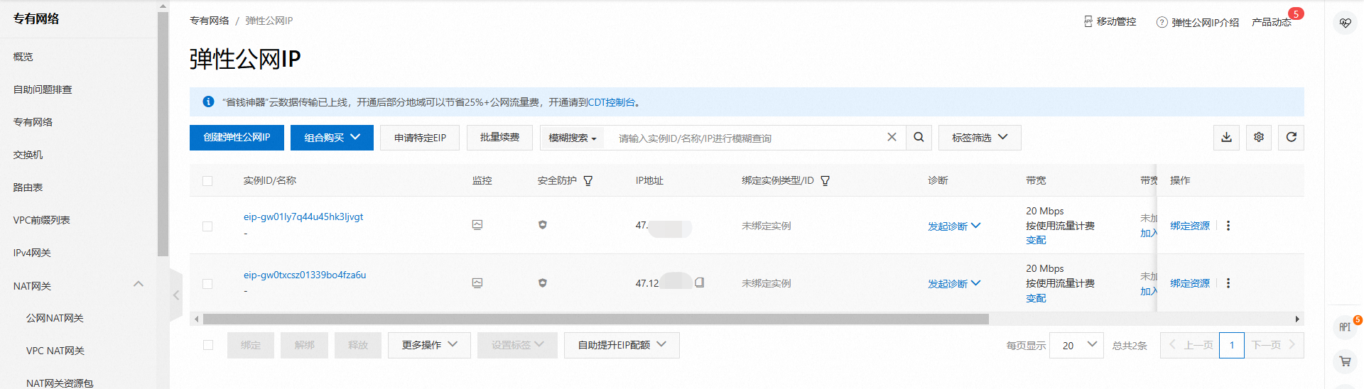 这里只创建了两个公网IP,做演示使用,其中一个直接绑定ECS服务器,另一个通过绑定弹性网卡,然后弹性网卡再绑定ECS服务器,实现间接绑定。