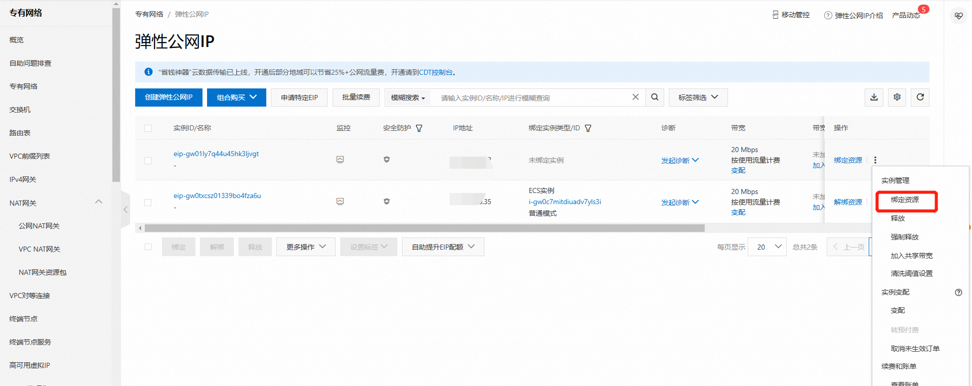 - 任意选择一个公网IP,进行绑定ECS服务器