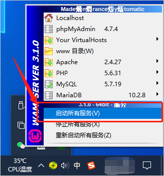 只要wamp启动成功,其图标就会变为绿色。
