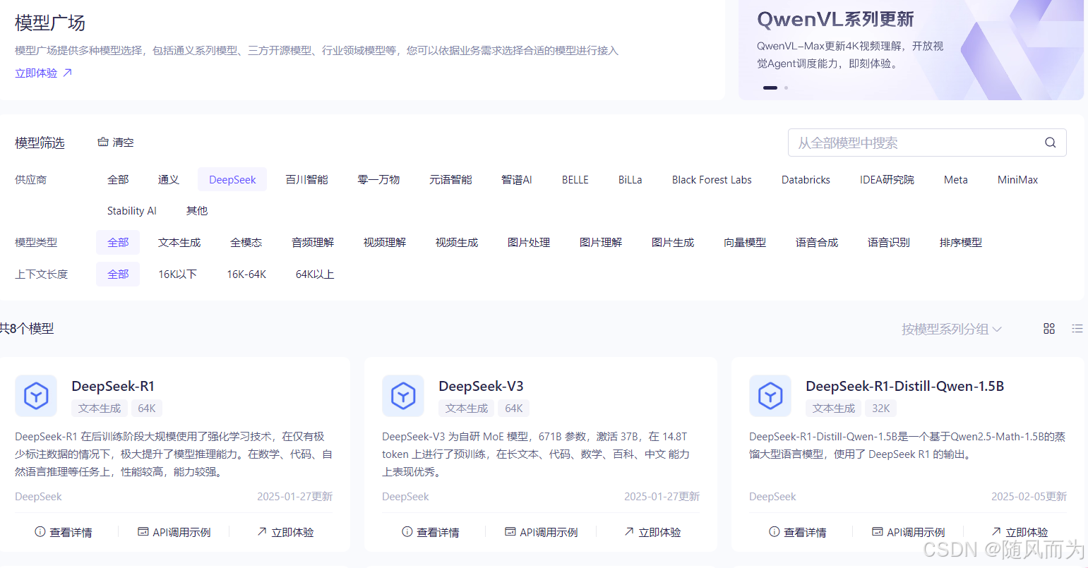 进入阿里云官方网站,登录账号。然后搜索阿里云白炼并进入,点击左边界面的模型广场,可以看到阿里云上支持deepseek系列的模型,如下图所展示的: