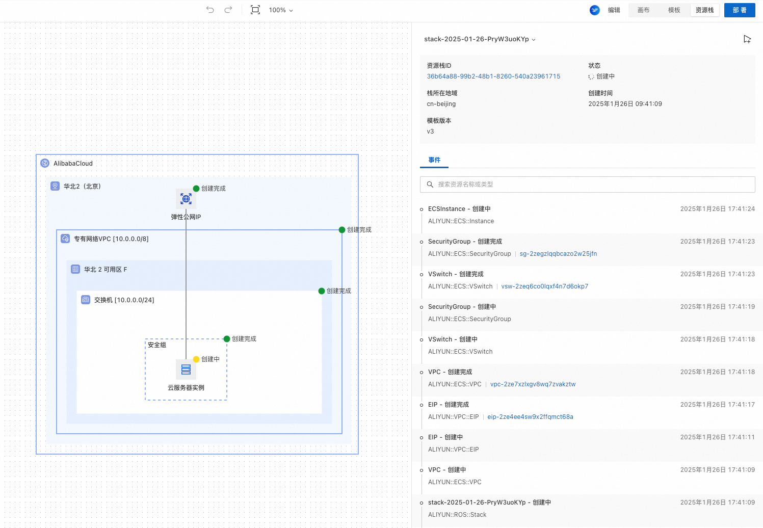 - 左边工具区,中间画布区,请开始你的表演: 🌐 单可用区网络拖到画布(这是你的地基) 🖥️ 云服务器实例拖进交换机(给地基上放个服务器小屋) 🔗 弹性公网IP扔到地域区(相当于给小屋挂门牌号)