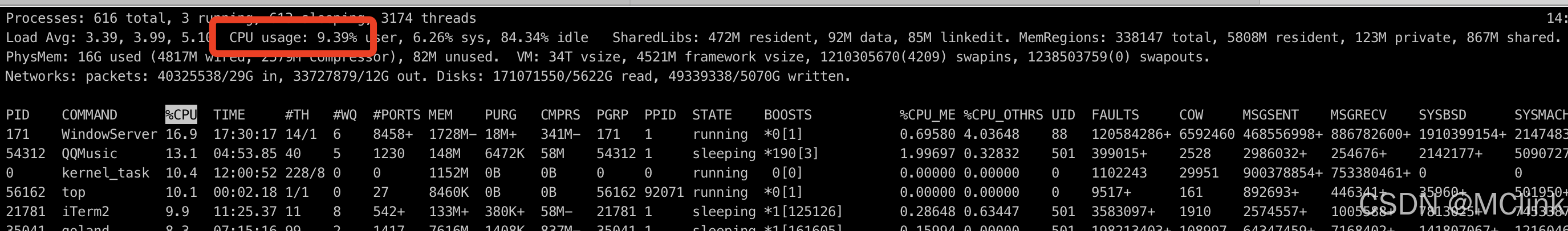 - CPU 使用率(CPU Utilization): 这是最常见的性能指标,表示 CPU 的当前使用情况。CPU 使用率过高可能意味着系统负载过重,进程竞争 CPU 资源。可以通过 top、vmstat 或 sar 等工具监控。