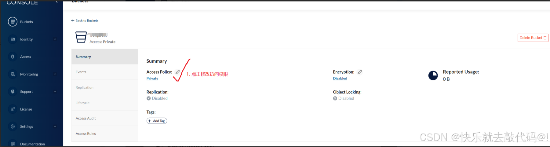 修改Bucket的权限,将private修改为public(以免后续上传图片时看不到图片)