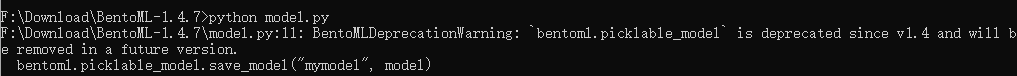 BentoMLDeprecationWarning 是一个警告并不是真正的错误。这个警告的意思是 bentoml.picklable_model 这个方法已经在 BentoML 1.4 版本中被弃用了,并且在未来的版本中将被移除。不用管这个警告就可以。