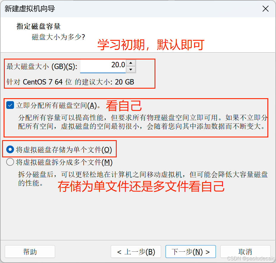 磁盘容量 磁盘大小默认即可,初期学习够用 立即分配所有空间为选择性勾选,看自己 存储为单文件会提高一些性能