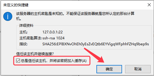 初次连接时,会提示是否信任该主机,打勾,并确认。
