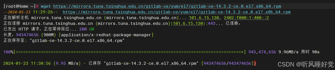 配置命令:wget https://mirrors.tuna.tsinghua.edu.cn/gitlab-ce/yum/el7/https://mirrors.tuna.tsinghua.edu.cn/gitlab-ce/yum/el7/gitlab-ce-14.3.2-ce.0.el7.x86_64.rpm 出现如下图所示表示下载完成,接下来就可以安装Gitlab了: