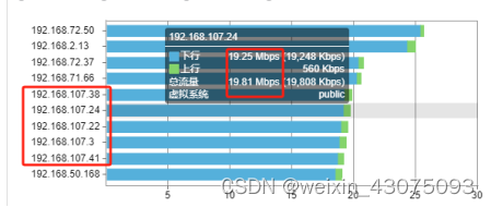 注意看,以下截图中,107网段每台电脑更新的流量占用,共有50台这样的win10系统,那么大部分带宽都被这个更新占用了。 1、同一时间内,192.168.107.0/24网段使用的上行与下行速率都较高,如下图: