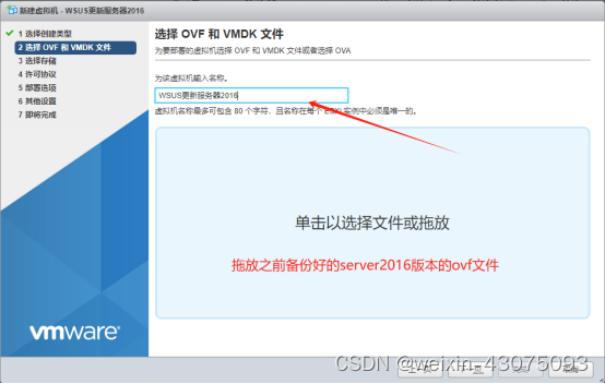 2、指定新的WSUS服务器名称,并拖放备份好的OVF模板(此处也可使用ISO安装版本,进行新的server 2016安装)