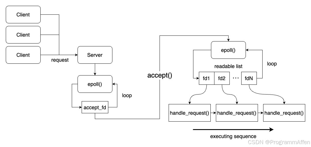 n就是列表的长度。Linux则为我们提供了IO多路复用这一机制,可以直接返回监听列表中所有状态发生变化的socket(或者其他file descriptor,以下简称fd),避免了遍历一遍却只有很少甚至没有fd发生变化的窘境,提高了性能。就像本节开头提到的煎饼果子老板的做法,直接拿到准备好下单顾客的需求,而不是挨个询问。 由于本文不是主要介绍IO多路复用的文章,在这里一步到位使用epoll进行监听,对此不太熟悉的读者可以先了解select、poll到epoll的发展过程以及它们的使用方法。