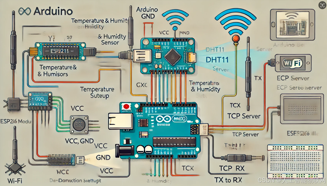 使用 Arduino 和 ESP8266 模块,结合 DHT11 温湿度传感器,可以实现从传感器收集环境数据并通过 Wi-Fi 将其发送到远程的 TCP 服务器。以下是详细的步骤,包括硬件连接、软件编写以及数据发送过程的详细描述。
