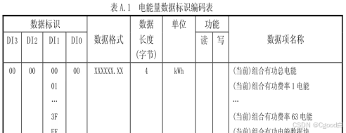 得到数据项标识 00 00 00 00,查询DLT645-2007协议,可以知道,00 00 00 00 标识当前组合有功总电能,即我们常用的电量值。