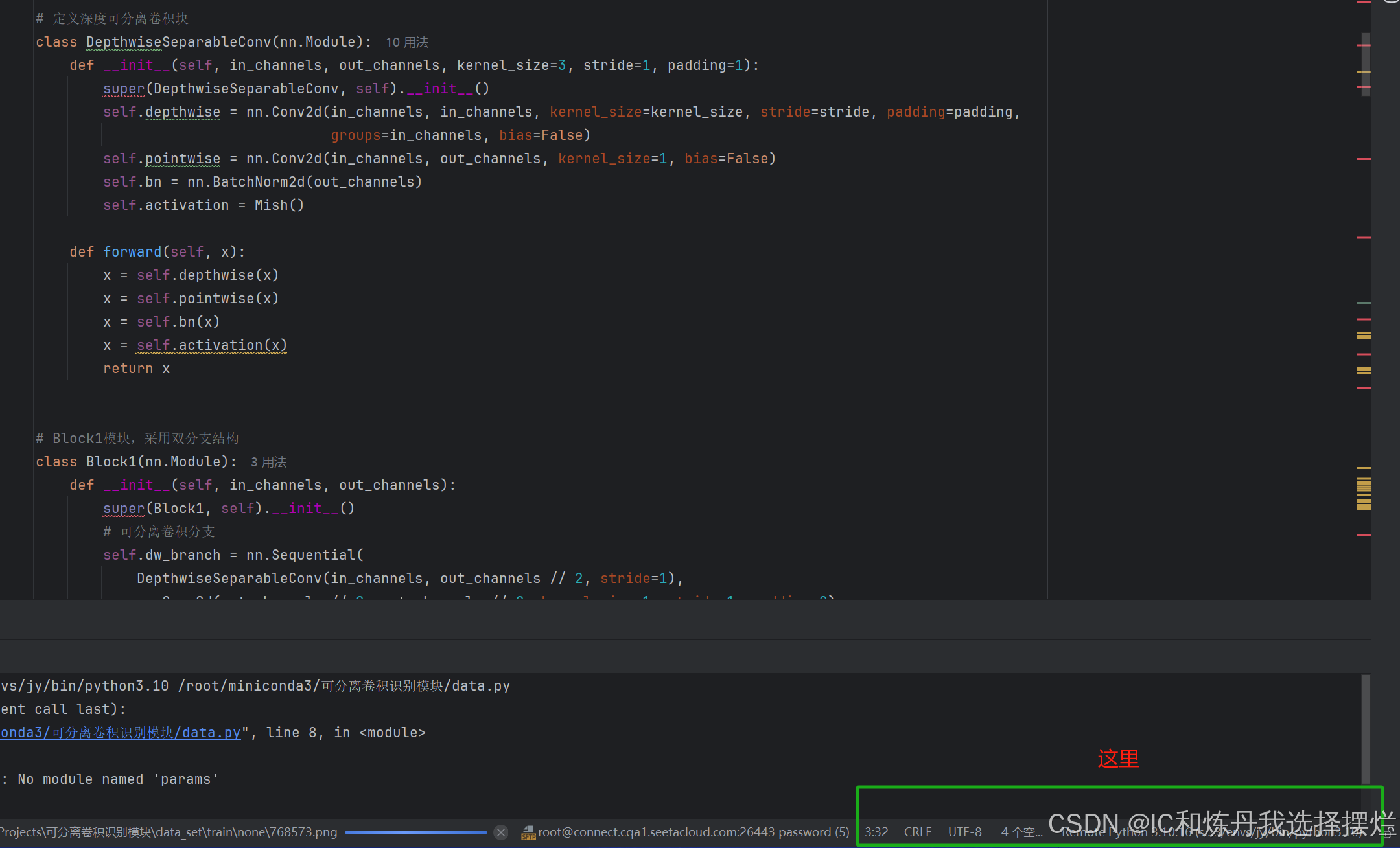 (11)点击文件(files)——>设置(settings)——>项目:可分离卷积——>python解释器,观看软件包,若有你在远端服务器conda装的所有包,证明成功