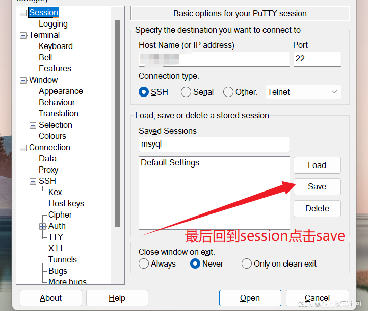 注意!这里是填localhost:远端端口 ,例如我的远端mysql是13309,这里配置就是localhost:13309,而不是服务器ip:13309, source port 填本地端口,随便填,这里我填3307.解释一下为啥这里是loaclhost,这里的localhost并不是我们以为的localhost(127.0.0.1)而是远端的ip地址,putty隧道会默认将destination中的localhost解析为远端服务器ip地址。另外强调一点,source port 不要用3306因为可能你本地有数据库并且端口为3306那么就会连接到你本地的mysql。所以建议配置除了3306以外的其他端口,避免和本地mysql冲突。隧道打通之后我们就可以用任何数据库用户连接数据库了。 - 做好以上配置后需要回到session中保存配置,给这个配置取个名,即填写Saved Sessions这里我叫msql,保存后我们就不用每次要连接都要配置一下,直接双击我们配置好的名称即可连接远端如下图所示: