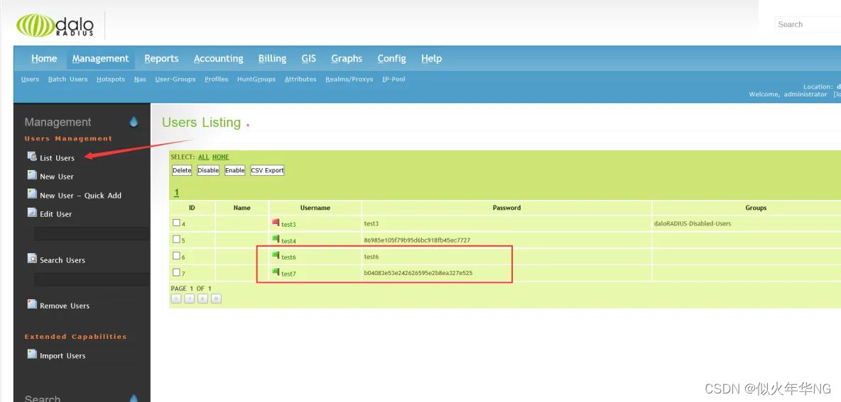 daloRADIUS的设置,主要用到的功能就是Management、Accounting、Config。