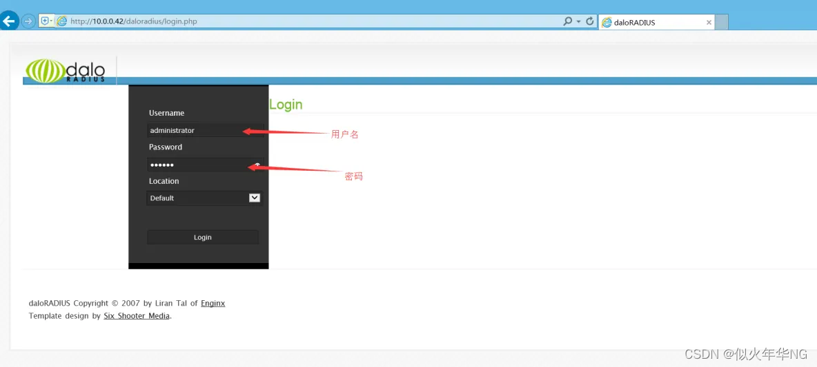 浏览器输入:http://yourip/daloradius。 默认用户:administrator 默认密码:radius