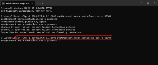 ssh -CNg -L 8000:127.0.0.1:6006 #远程主机的用户名和地址# -p #指定端口号# #该命令通过 SSH 建立一个隧道连接,将本地 8000 端口的请求转发到远程服务器的 6006 端口,例:ssh -CNg -L 8000:127.0.0.1:6006 root@connect.westx.seetacloud.com -p 53340。