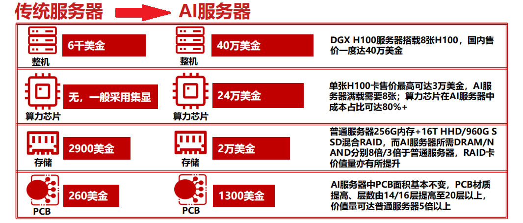 自然语言和图形处理依赖大量存储器,AI服务器对数据传输速度提出更高要求,推动了存储和PCB价值量的上升。