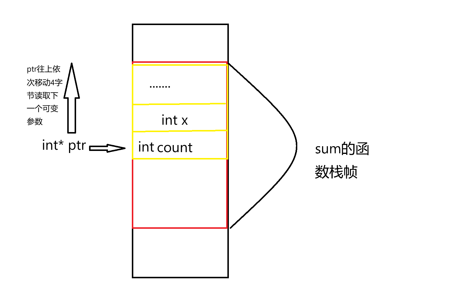 所以要使用可变参数,就要求我在至少给一个最左侧的固定参数,因为我们需要一个起始地址,那么接下来我们可以通过指针来指向它,然后通过移动该指针,然后依次访问到右侧的参数,但是为了不引发越界,我们一般可以采取两种方式,第一种方式就是最左侧的固定参数的值设置为可变参数的数量,然后我们首先获取到左侧的固定参数从而获取指针移动的次数,那么以下面的sum函数为例子: