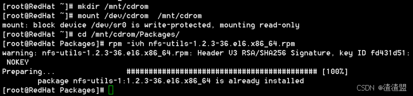 [root@localhost Packages]# rpm -ivh nfs-utils-1.2.3-36.el6.x86_64.rpm //这一步要注意所安装软件包的名称,要从Package里面找到准确的名称