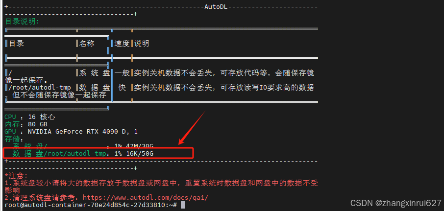 使用命令:cd lanyun-tmp 进入数据盘,数据盘内存更大。