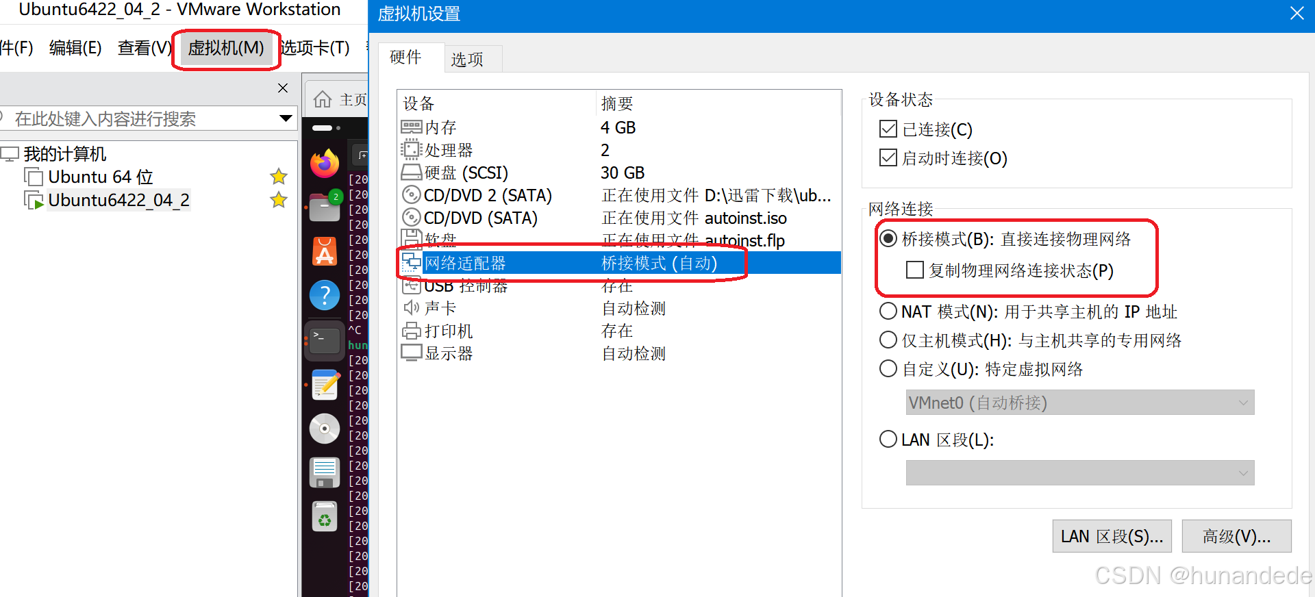 首先要将 ubutun 的网络模式设置为桥接模式