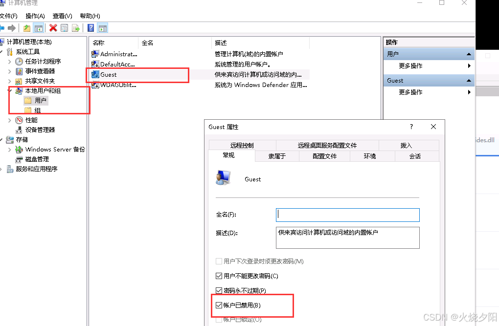 【开始】→【Windwos管理⼯具】→【计算机管理】→【本地⽤户和组】→【⽤户】→【右键属性】→勾选【账户已禁⽤】→点击【确定】;同样方法自行选择,可以把不用的账户都禁用了