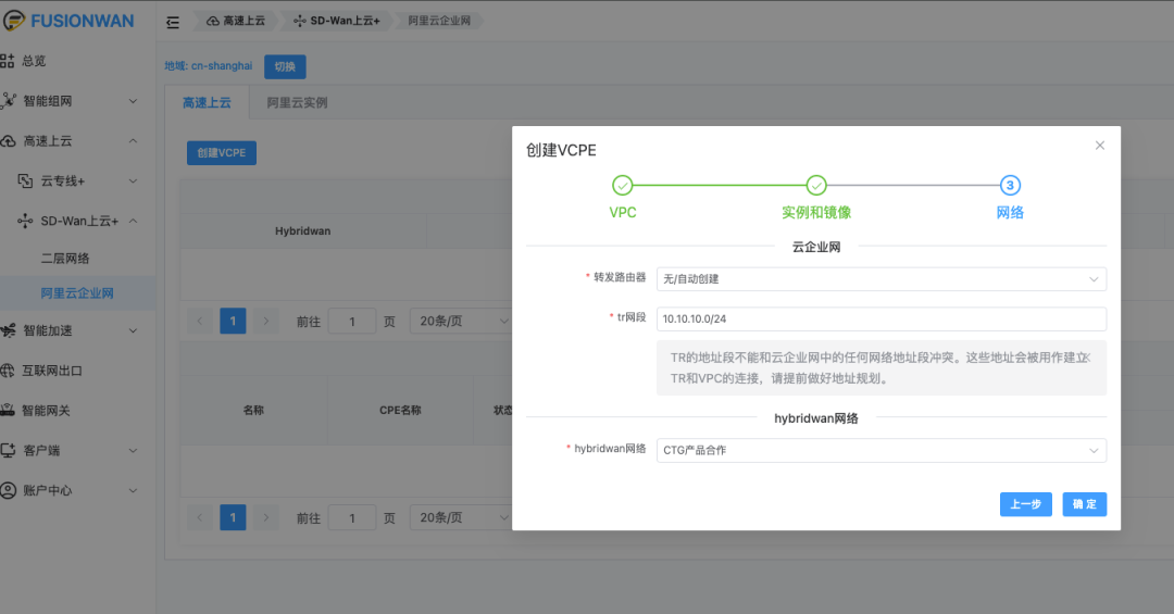 - 一键快速部署:通过Fusion WAN平台或阿里云CEN控制台(三方SD-WAN伙伴商品),用户能够在短短几分钟内迅速部署虚拟CPE(vCPE),省去繁琐的手动配置和安装步骤,让云专线业务快速上线。并借助NIS的智能诊断功能实现“无人值守”运维。
